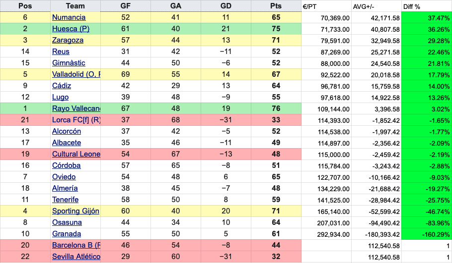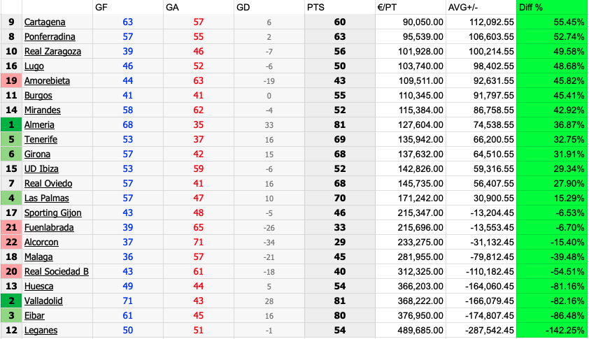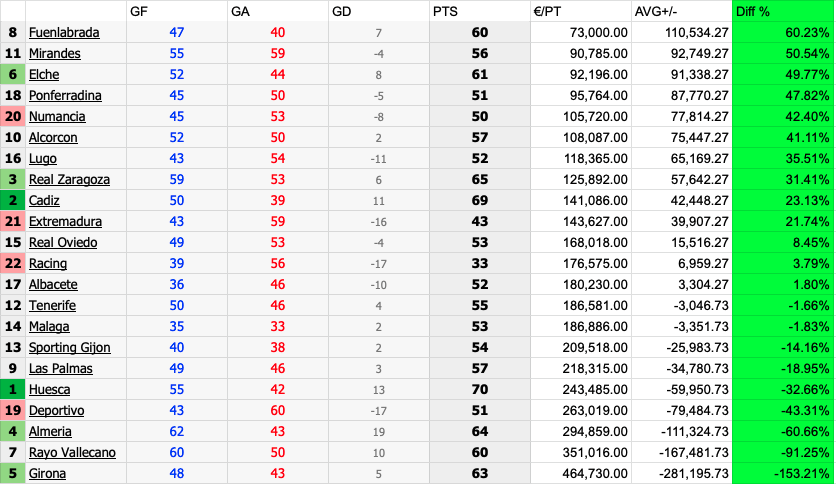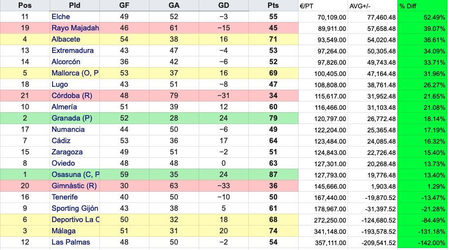 The title of worst performance over the last five seasons goes to Granada in 2017/2018, who by finishing 10th spent 160% more than the average cost per point. Although it was rectified the following season as they achieved promotion at a much more healthy 18% under the league average, it could have been a lot worse.
