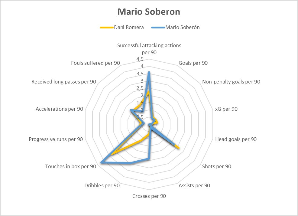 Soberón often plays more as an inside forward from the wing with Ortuño up front (at least that was the case against Baleares). But it’s interesting to see the similarity between Romera and Soberón. They are extremely similar both statistically and height wise, even though Romera has played more alone up front so far this season.