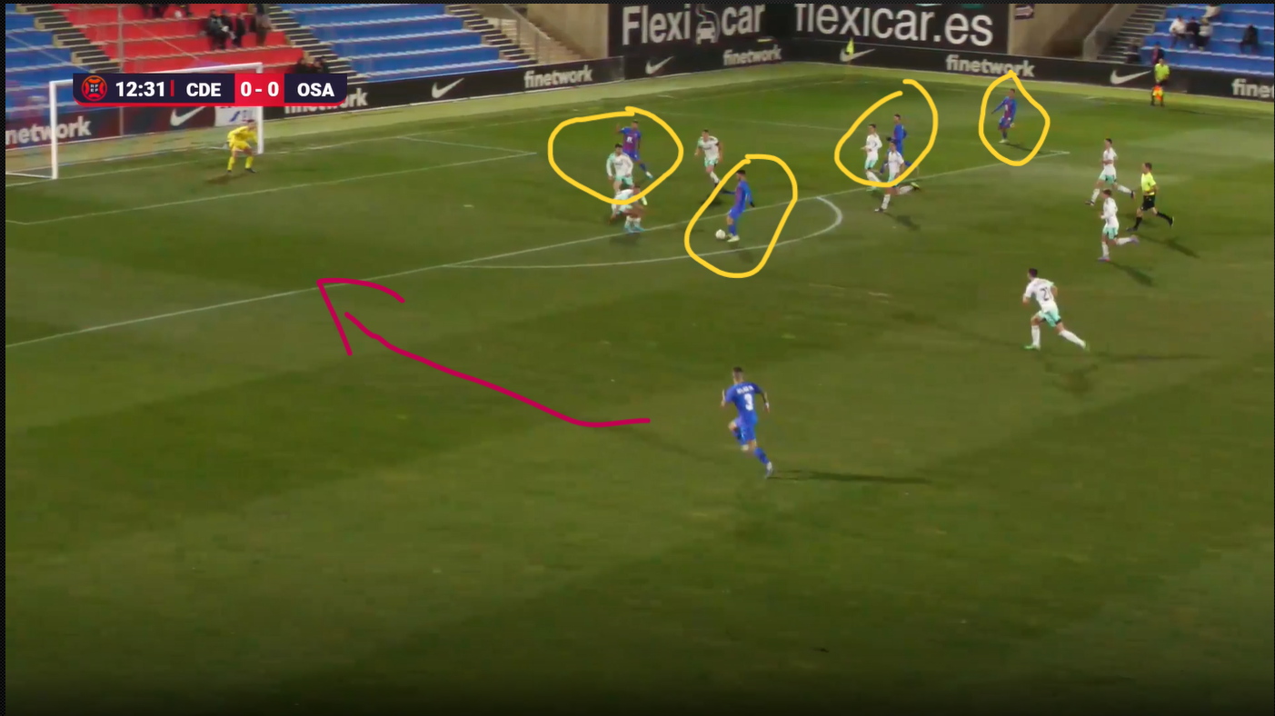 Four Eldense players are located on one side of the pitch, dragging the right back over who is supposed to be covering the open space, and that leaves room for Eldense left back Alex Martinez to make the run and eventually put in a dangerous cross to a crowded penalty area.