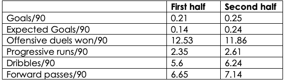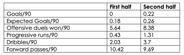 The stats also show the added impact of both players in substitute roles, especially in the case of the Georgian. There are increases across the board in the second half numbers, compared to the first half. Kochorashvili more than doubles the number of progressive runs he makes in the second half, with a significant difference in offensive duels won as well.