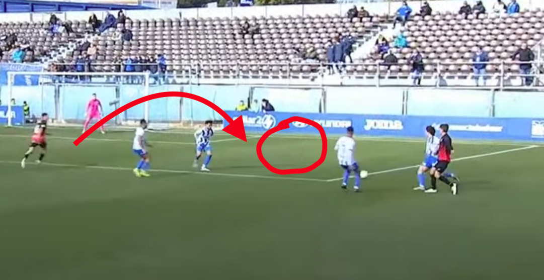 El ejemplo siguiente es de una situación más estática, con el Atlético dejando una enorme área de espacio abierto a la que pasar. Ninguno de sus defensas se echa atrás para ocupar el espacio, lo que deja al jugador de La Nucía libre para correr hacia él y marcar.